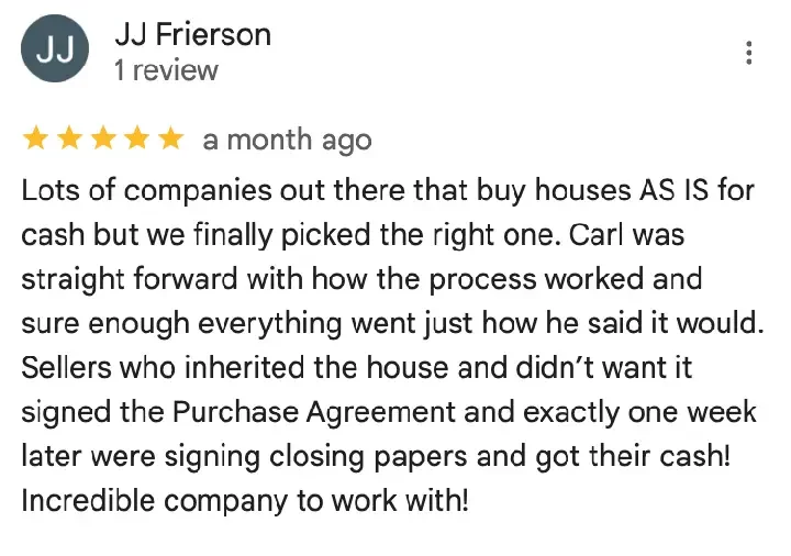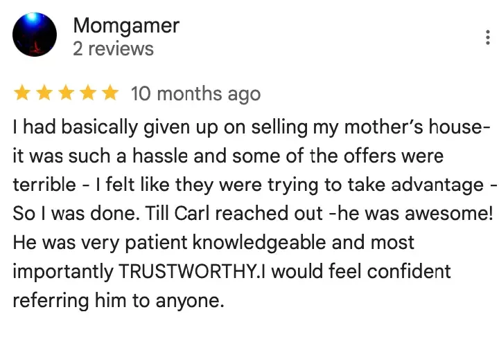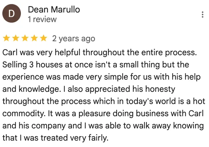 “My father passed and left my brother and I 3 rental houses. I tried managing them for about a year but got very fed up dealing with tenants. Carl came and met the tenants and made me an offer that worked for me. The transaction was simple and easy!”