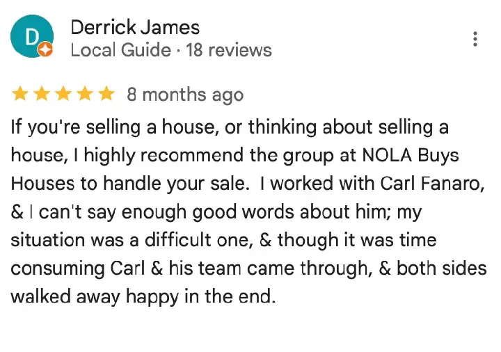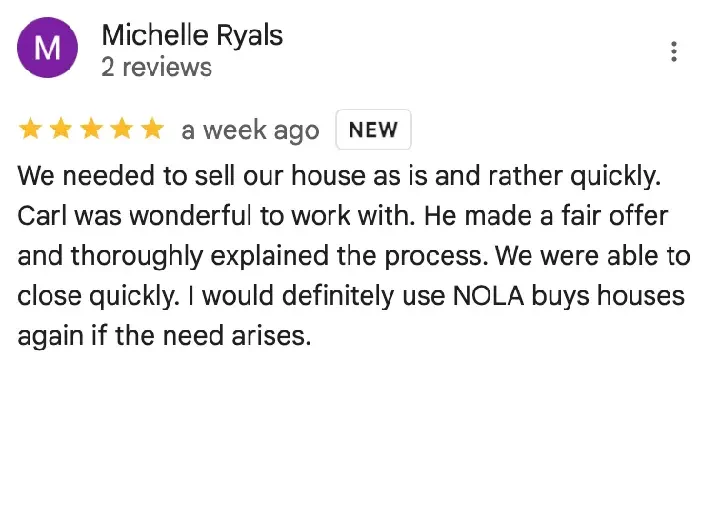“We had a fantastic experience. Everyone was very helpful, the process was simple and straightforward and if need be, we would absolute use NOLA Buys Houses again. Highly recommended.”