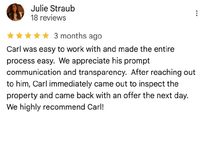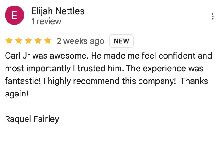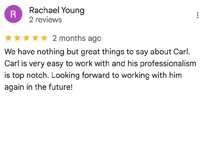 “Where do I begin? First off, Carl is amazing! He made this process easy and simple. Everything was done in a timely matter. Going with his company was the best decision I’ve ever made. Thank you, Carl!”